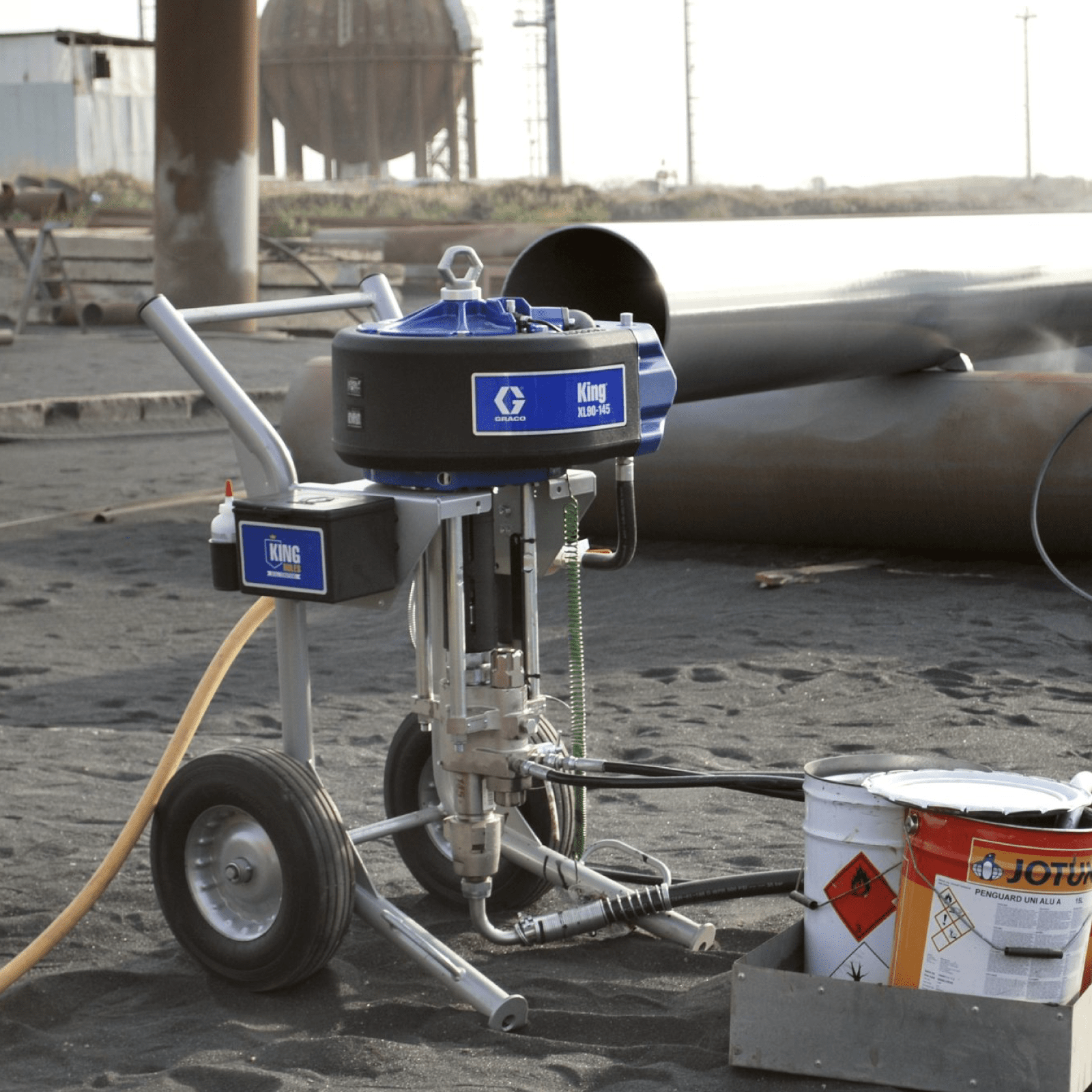 Los pulverizadores neumáticos King son las máquinas más potentes para recubrimientos protectores. El sistema proporciona equipos de alta calidad, alto volumen y alta presión con la capacidad de pulverizar hasta seis pistolas. Proporciona al aplicador valores de rendimiento, relaciones de presión y capacidades de bombeo nunca antes vistas.